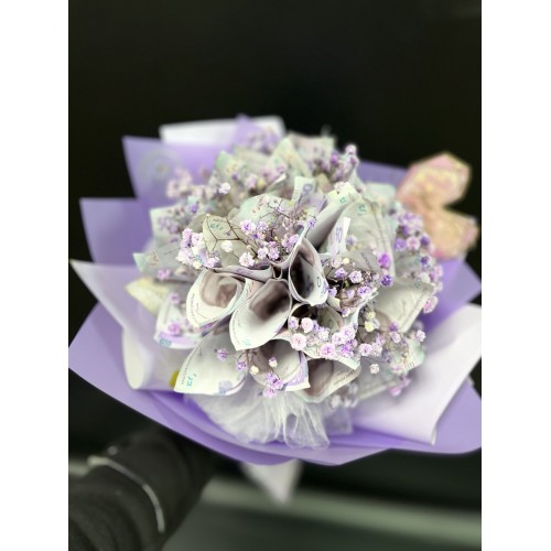 Букет із грошей з гіпсофілою — оригінальний та стильний подарунок, що поєднує купюри з ніжними квітами гіпсофіли. Ідеально для будь-якого свята.